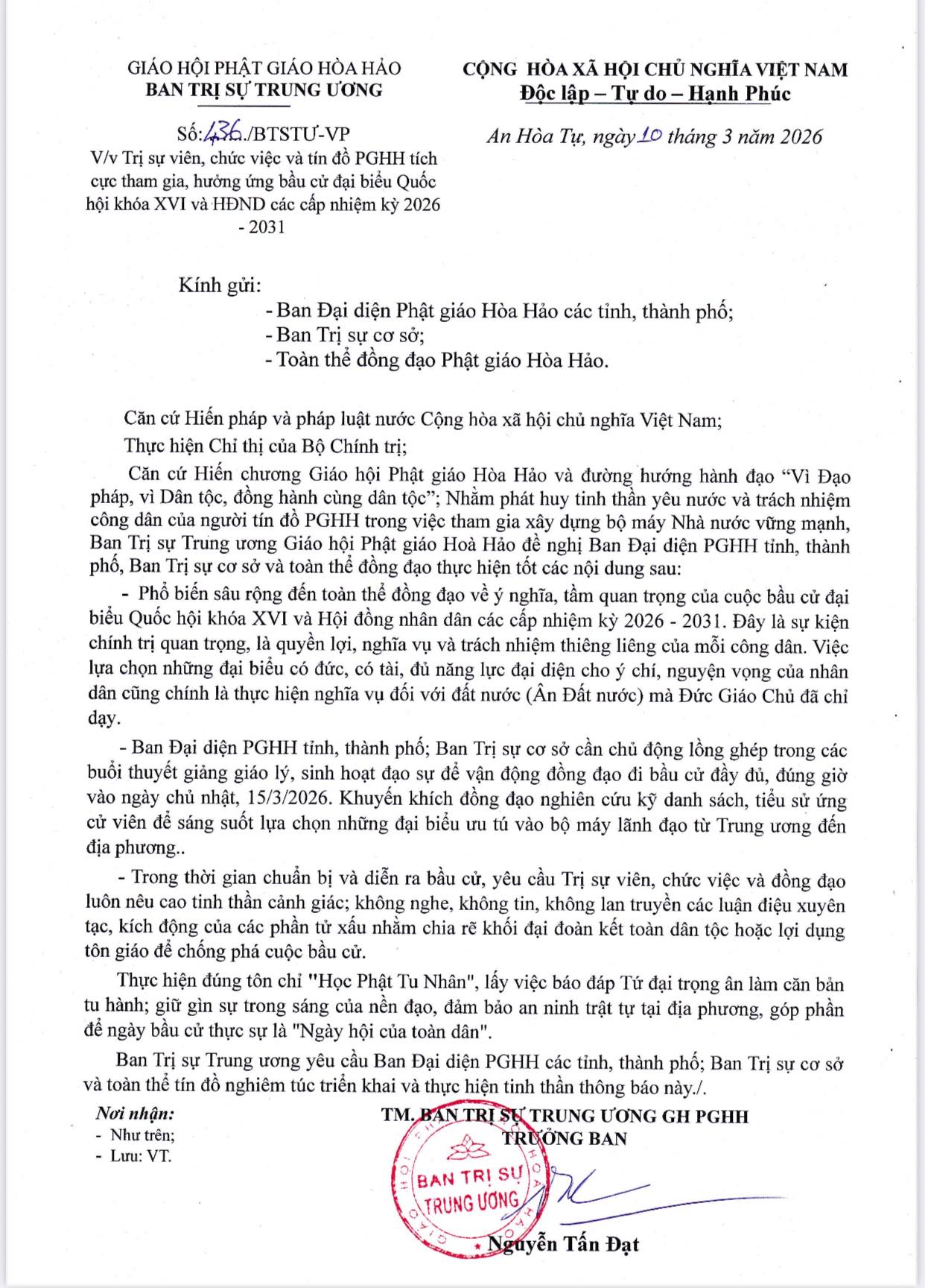 Công văn số 436/BTSTƯ-VP, ngày 10 tháng 3 năm 2026 của Ban Trị sự Trung ương Giáo hội Phật giáo Hoà Hảo về việc Trị sự viên, chức việc và tín đồ PGHH tích cực tham gia, hưởng ứng bầu cử đại biểu Quốc hội khóa XVI và HĐND các cấp nhiệm kỳ 2026 - 2031