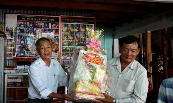 Ông Lê Tấn Phú – Thư ký Ban Từ thiện Xã hội tặng quà cho ông Nguyễn Hồng Nguyện – Trưởng ban Ban Trị sự PGHH phường Bình Thạnh