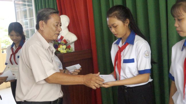 Ông Lê Thanh Bồ - Phó Trưởng ban Khuyến học PGHH đại diện trao học bổng Hương Sen Hòa Hảo cho các em học sinh