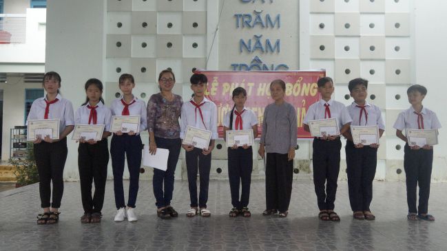 Học sinh trường THCS thị trấn Tri Tôn (huyện Tri Tôn) nhận học bổng Hương Sen Hòa Hảo
