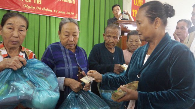 Trong dịp này, đoàn Ban Từ thiện Xã hội Ban Trị sự Trung ương Giáo hội PGHH và Mạnh Thường Quận kết hợp tặng 120 suất quà cho bà con nghèo của xã Lê Trì (huyện Tri Tôn, tỉnh An Giang), mỗi phần quà trị giá khoảng 350 ngàn đồng giúp bà con giảm bớt sự khó khăn trong cuộc sống.