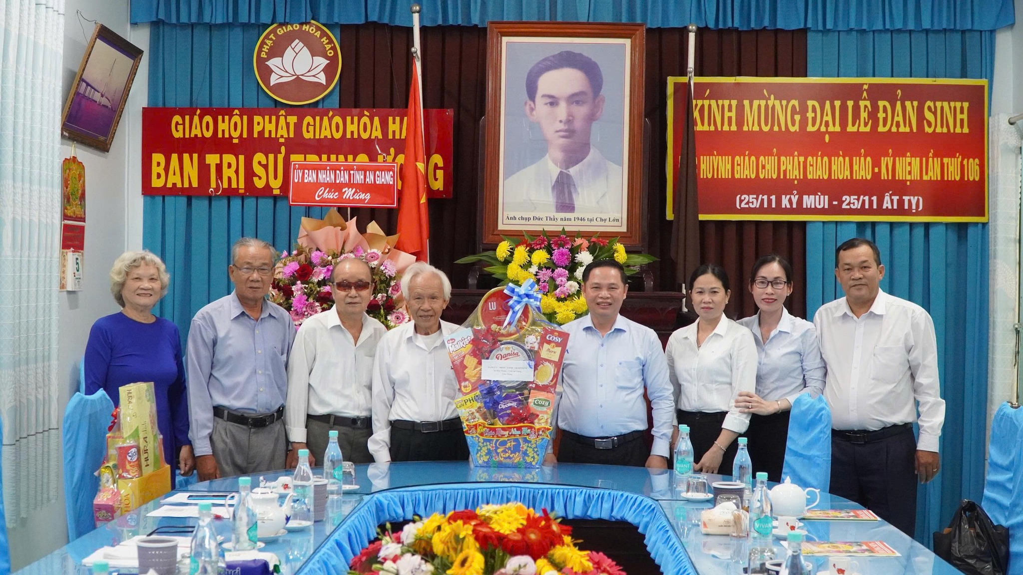 Ban Trị sự Trung ương đón tiếp đoàn công tác gồm có ông Nguyễn Tấn Đạt, Trưởng Ban Trị sự Trung ương Giáo hội Phật giáo Hòa Hảo; ông Lê Ngọc Lợi, Phó Trưởng Ban Trị sự Trung ương, Trưởng Ban Từ thiện xã hội; ông Nguyễn Văn Lượng, Phó Trưởng Ban Trị sự Trung ương, Trưởng Ban Tổ chức – Nhân sự; bà Diêu Huệ Nương, Ủy viên Ban Thường trực, Phó Trưởng Ban Tài chính.