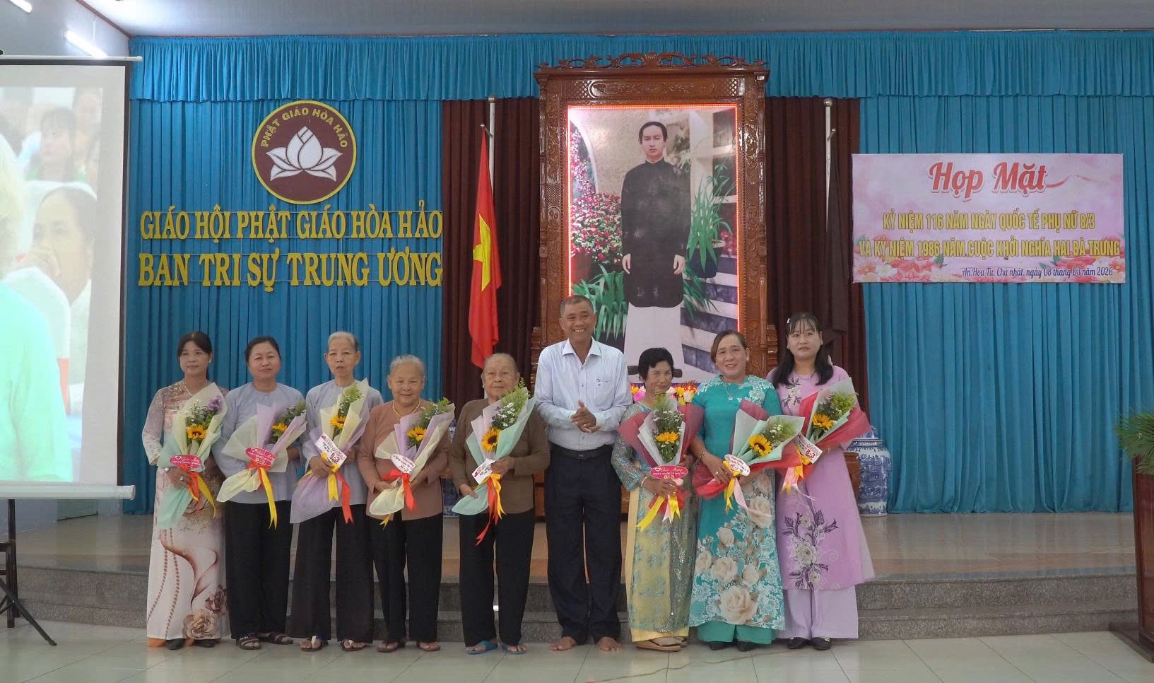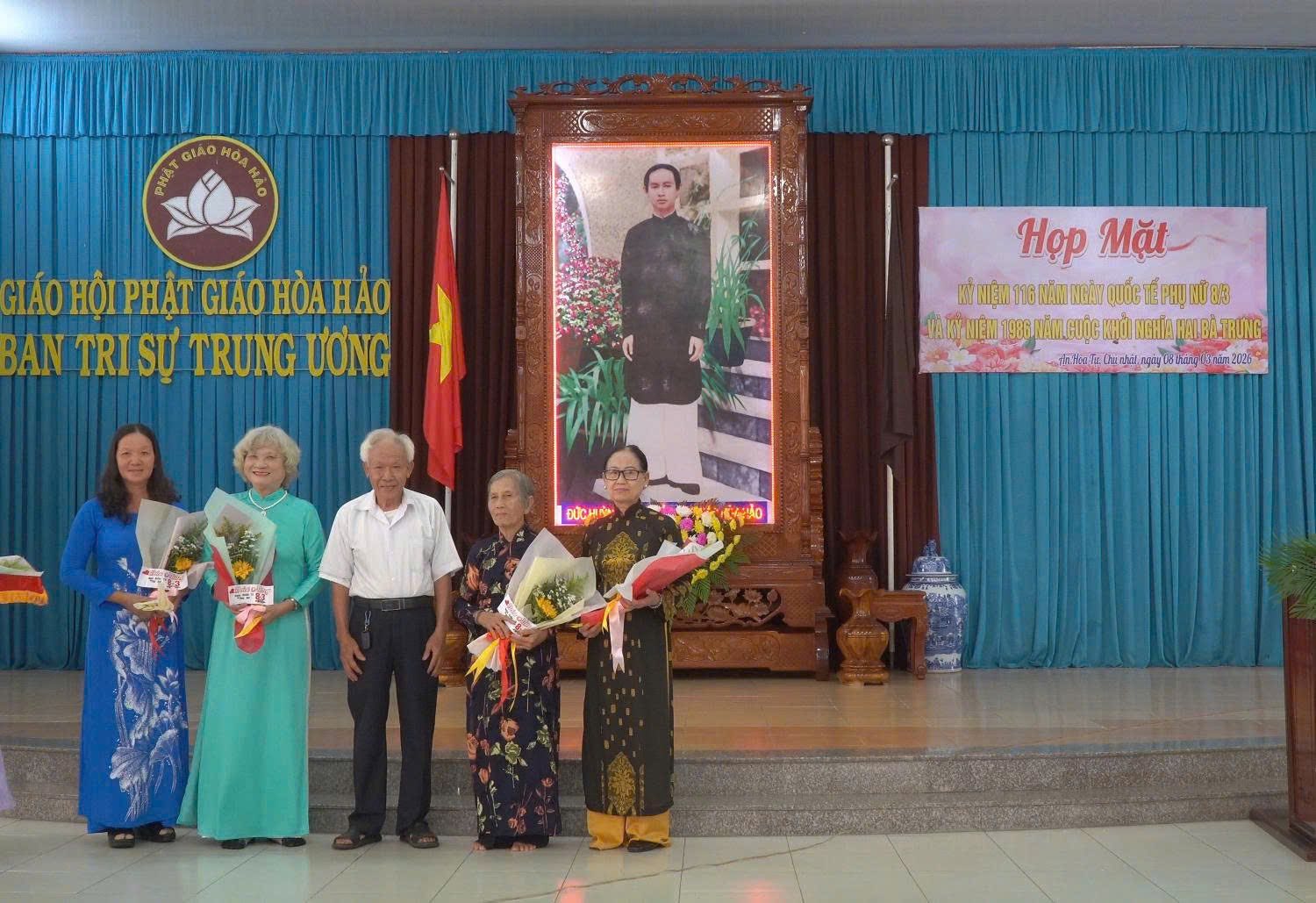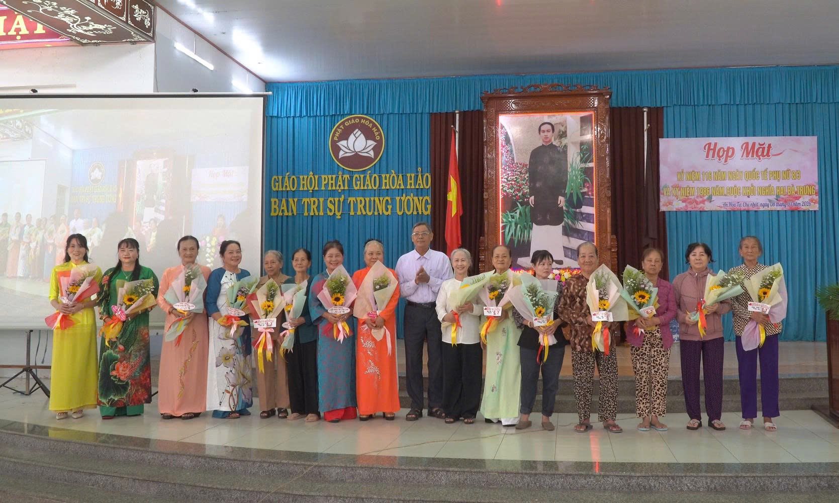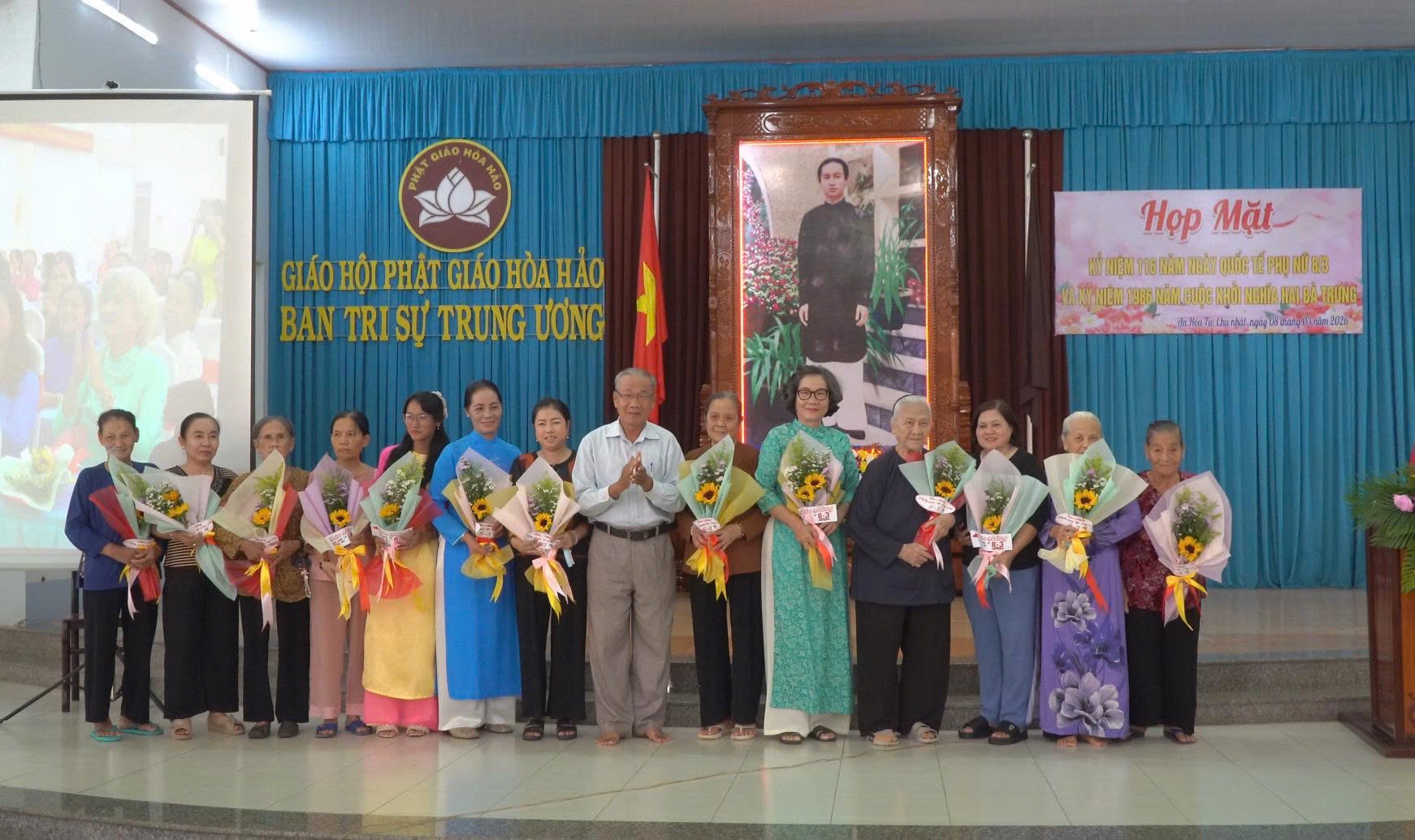 Sáng ngày 8/3/2026, Ban Trị sự Trung ương Giáo hội Phật giáo Hòa Hảo tổ chức buổi Họp Mặt Kỷ niệm 116 năm Ngày Quốc tế Phụ nữ (8/3/1910 - 8/3/2026) và 1986 năm Khởi nghĩa Hai Bà Trưng (40 - 2026) cho nữ tín đồ Phật giáo Hòa Hảo