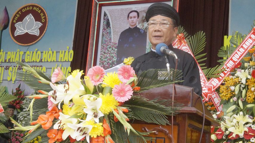 Ông Bùi Văn Đương - Phó Trưởng ban Ban Trị sự Trung ương, Phó Trưởng ban Ban Phụng tự Tổ đình Đức Huỳnh Giáo Chủ Phật giáo Hòa Hảo đọc tâm thư của Ban Trị sự Trung ương Giáo hội Phật giáo Hòa Hảo gởi toàn thể tín đồ nhân Đại lễ khai đạo