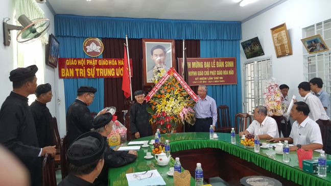 Sáng 27/12/20198, đoàn Tỉnh uỷ, HĐND, UBND, UBMTTQVN tỉnh Đồng Tháp đến thăm và chúc mừng nhân Đại lễ Đản sinh Đức Huỳnh Giáo Chủ Phật giáo Hoà Hảo năm thứ 99 (25/11 Kỷ Mùi – 25/11 Mậu Tuất) do ông Nguyễn Hữu Thời - Phó Ban Dân vận Tỉnh ủy làm trưởng đoàn cùng các ông: Lê Minh Trung - Phó Giám đốc Sở Nội vụ tỉnh; Châu Văn Tài - Trưởng ban Ban Tôn giáo Sở Nội vụ tỉnh; Nguyễn Thanh Phong - Phó phòng Dân tộc – Tôn giáo Ban Dân vận Tỉnh ủy; Trương A Mực - Chuyên viên Ban Tôn giáo, Sở Nội vụ tỉnh.