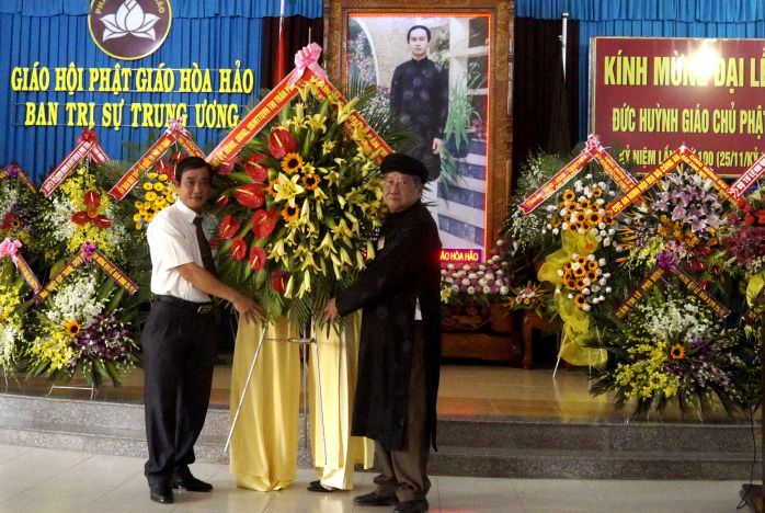 Nhân Đại lễ Đản sinh Đức Huỳnh Giáo Chủ PGHH lần thứ 100, Ban Trị sự Trung ương Giáo hội PGHH và Ban Tổ chức Đại lễ vinh dự tiếp đón các đoàn: Ban Tôn giáo Chính phủ; Bộ Tư lệnh Quân khu 9; Lãnh đạo ban ngành các cấp tỉnh An Giang, Cần Thơ, Đồng Tháp; Các Ban ngành, đoàn thể huyện Phú Tân, thị trấn Phú Mỹ; các Ban Chuyên ngành Ban Trị sự Trung ương, Ban Đại diện PGHH tỉnh, TP; Ban Trị sự Giáo hội PGHH xã, phường, thị trấn; Ban Quản tự các chùa PGHH; các nhà Mạnh Thường Quân cùng chư quý đồng đạo kính dâng đến Đức Tôn Sư nơi lễ đài 100 lẵng hoa và quà tượng trưng cho 100 mùa Đản sinh của Đức Huỳnh Giáo Chủ.