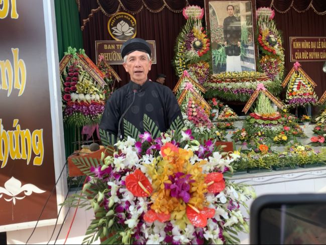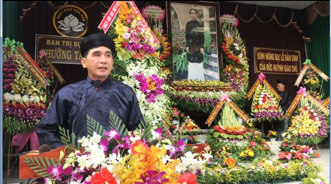 Ông Phan Văn Ước, Phó ban BTS phường Tân Lộc đọc bài Ý nghĩa ngày lễ Đản sinh Đức Huỳnh Giáo Chủ