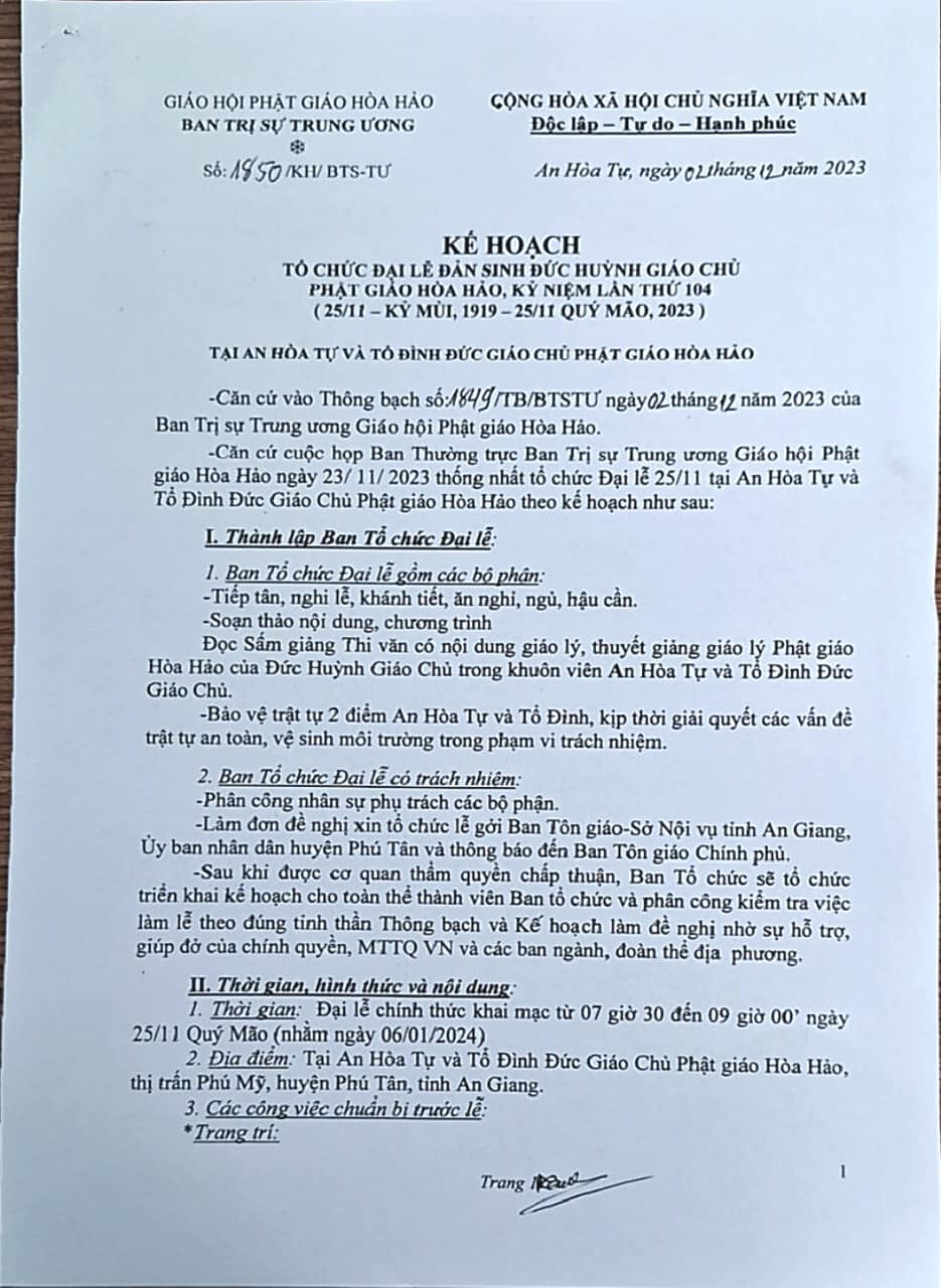 Kế hoạch số 1850/TB/BTSTU ngày 02/12/2023 của Ban Trị sự Trung ương Giáo hội Phật giáo Hoà Hảo về việc Tổ chức Đại lễ Đản sinh Đức Huỳnh Giáo chủ Phật giáo Hoà Hảo kỷ niệm lần thứ 104 (25/11 Kỷ Mùi, 1919 - 25/11 Quý Mão, 2023).